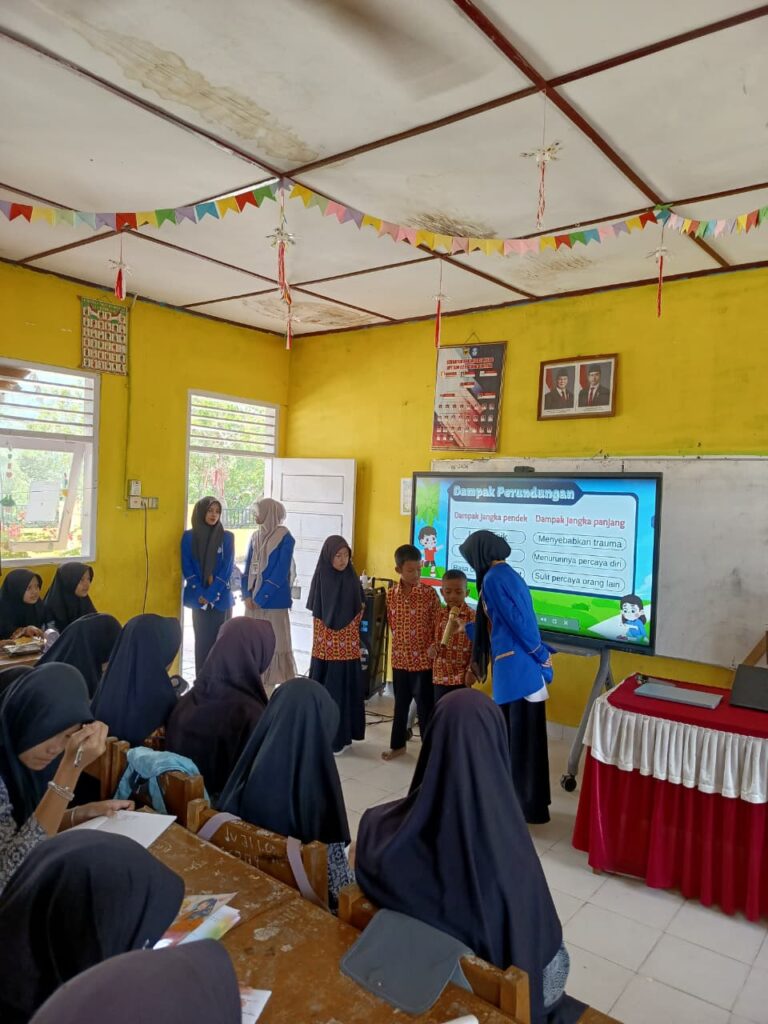 Mahasiswa HMPS Psikologi Islam menyampaikan materi sosialisasi mengenai bullying secara interaktif dan komunikatif. Materi yang disampaikan meliputi pengertian bullying, jenis-jenis bullying seperti bullying fisik, verbal, dan sosial, serta dampak negatif yang dapat ditimbulkan baik bagi korban maupun pelaku. Selain itu, siswa juga diberikan pemahaman mengenai cara mencegah dan menghadapi bullying, termasuk pentingnya berani melapor kepada guru atau orang dewasa yang dipercaya.